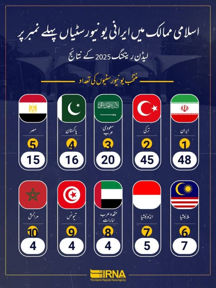 تہران – ارنا – لیڈن کی درجہ بندی کے مطابق، ایران، اس درجہ بندی کے نظام میں 48 یونیورسٹیوں کے ساتھ، گزشتہ سالوں کی طرح، یونیورسٹیوں کی تعداد کے لحاظ سے اسلامی ممالک میں پہلے نمبر پر ہے۔ ایران کے بعد ترکی اور سعودی عرب بالترتیب 45 اور 20 یونیورسٹیوں کے ساتھ دوسرے اور تیسرے نمبر پر ہیں۔