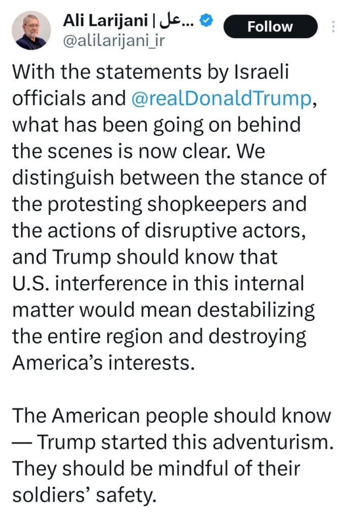 تہران (IRNA) ایران کی سپریم نیشنل سیکورٹی کونسل کے سیکریٹری علی لاریجانی نے کہا ہے کہ صیہونی حکومت اور ٹرمپ کے موقف سے ایران کے حالیہ واقعات کا پس منظر واضح ہوگیا۔